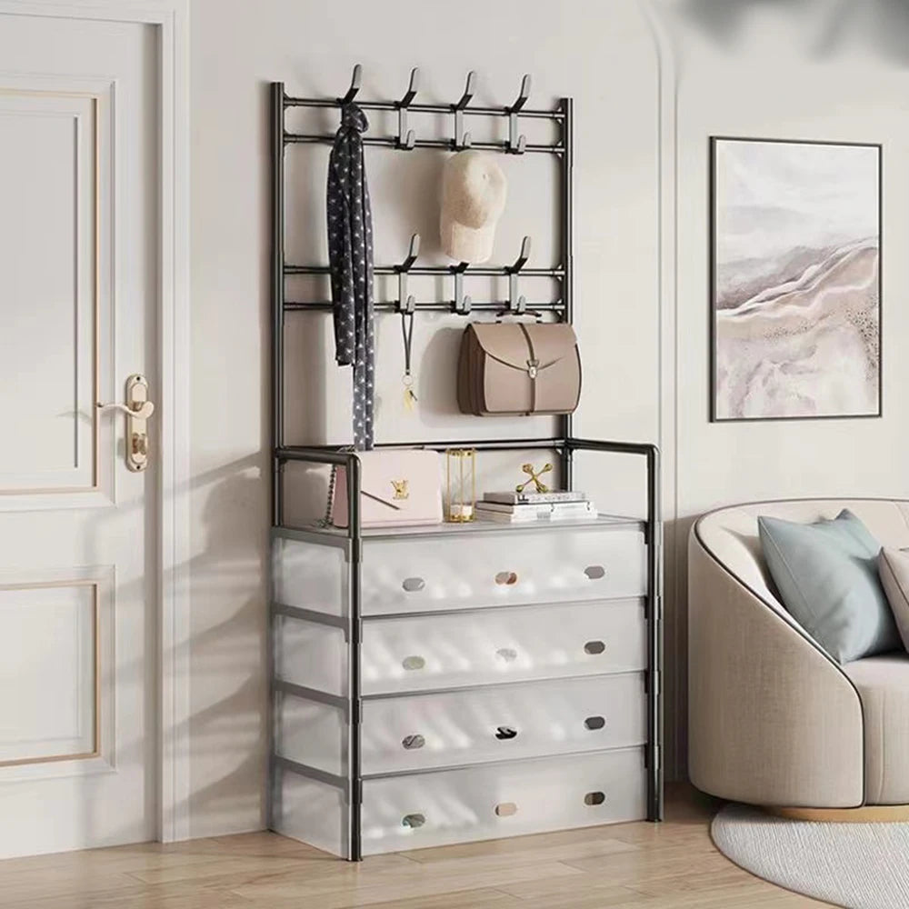 Diseño todo en uno: perchero, zapatero y estantería integrados en una estructura vertical compacta.