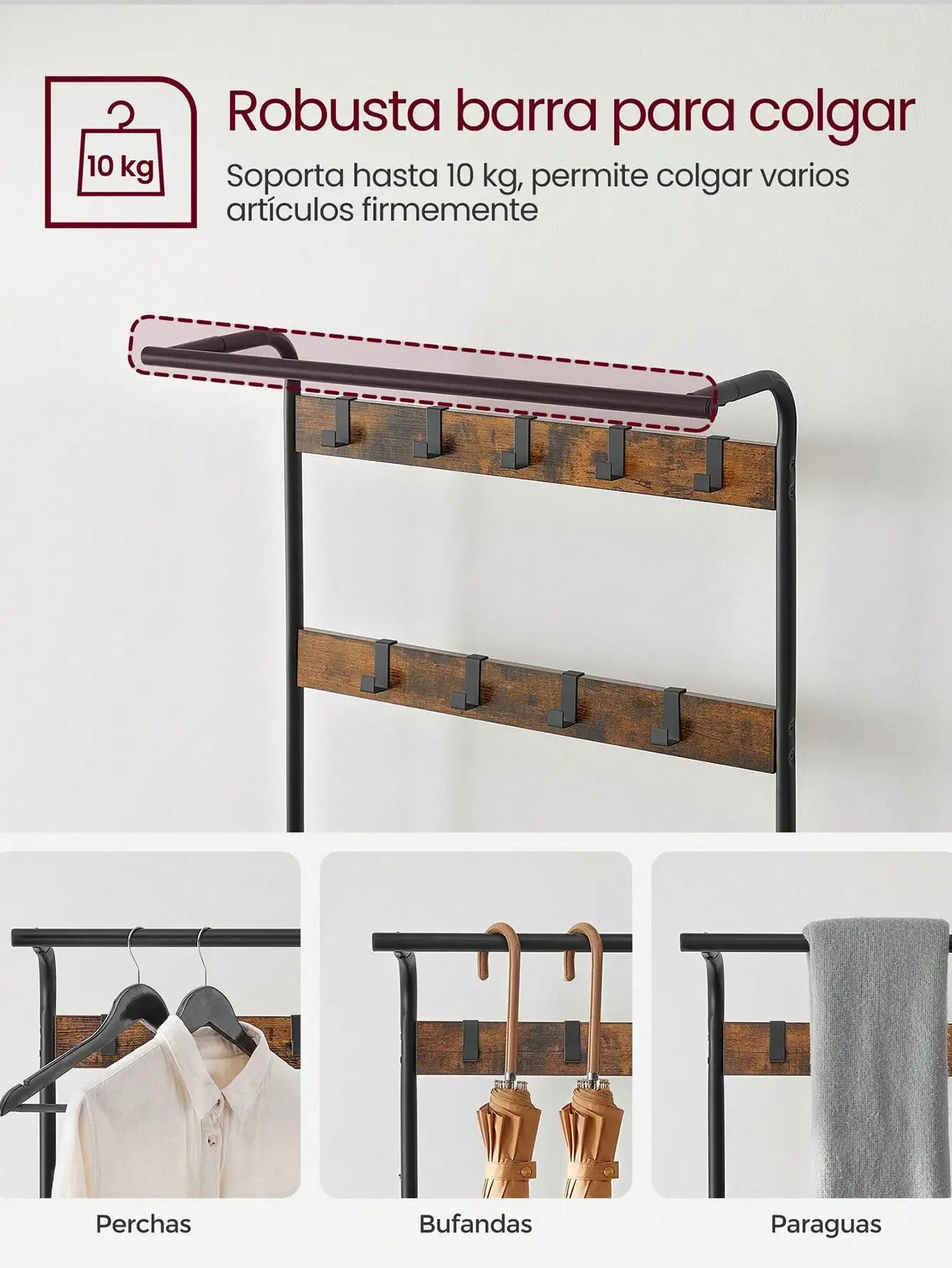 Barra colgante superior: práctica y estable, ideal para colgar pañuelos, paraguas o añadir perchas adicionales.