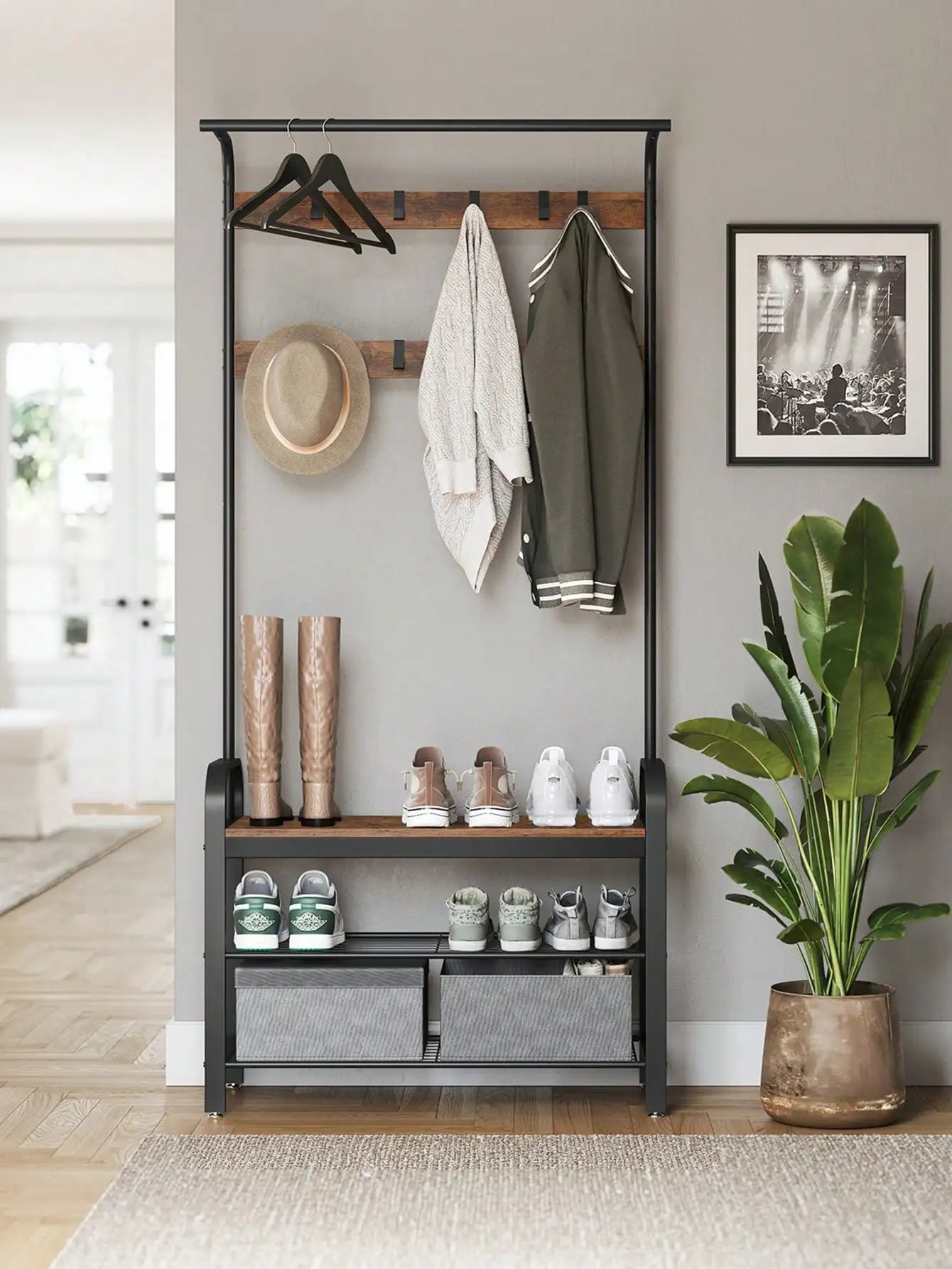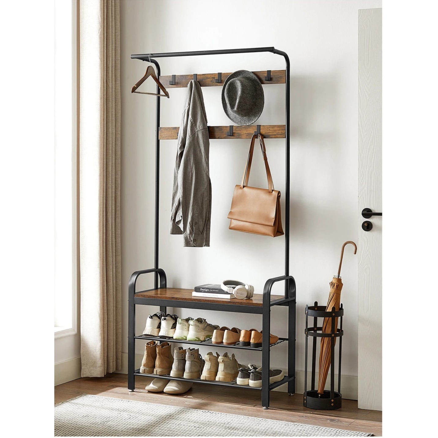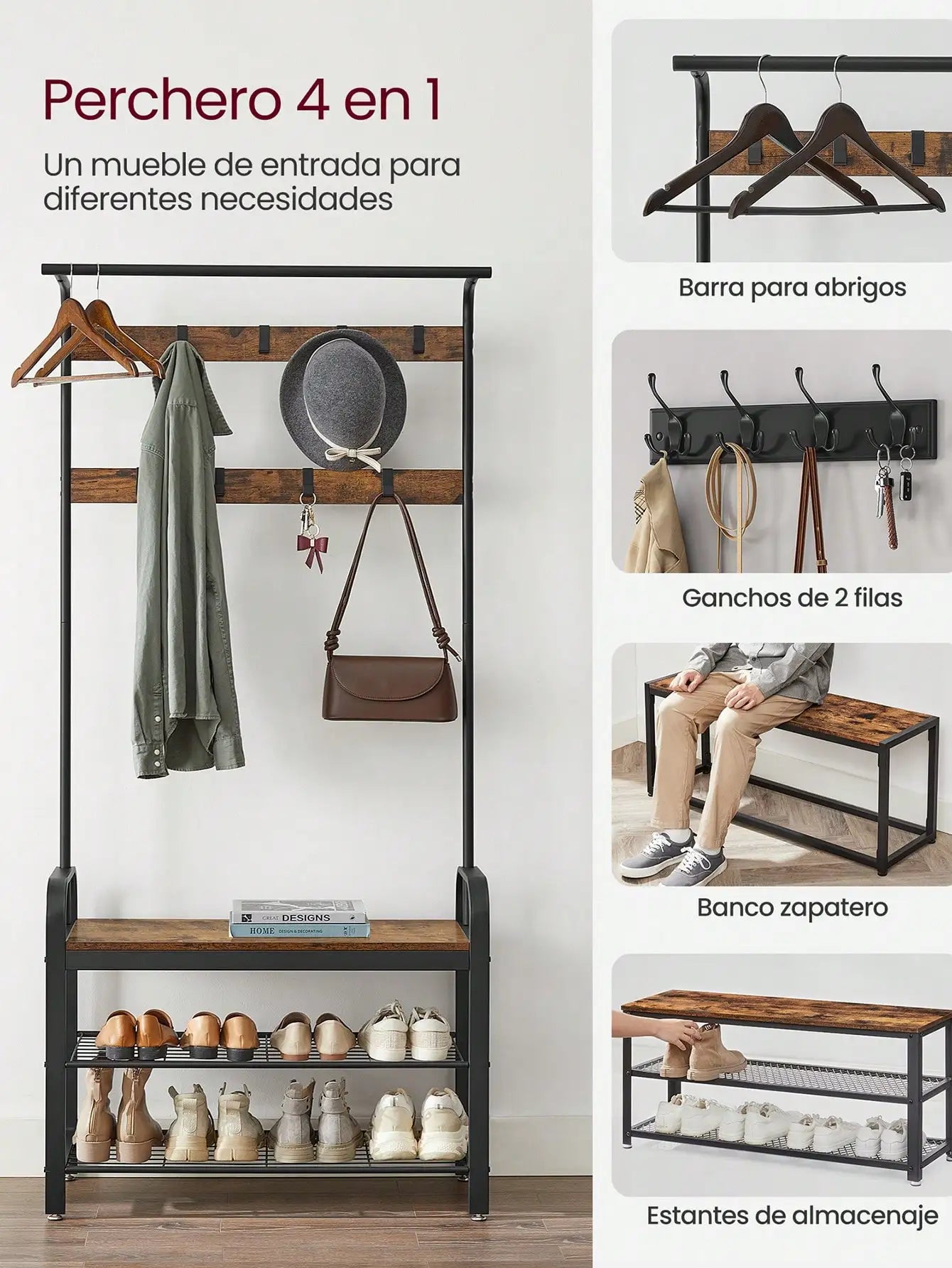 Diseño multifuncional 4 en 1: barra colgante superior, ganchos, banco resistente y estantes zapatero integrados.