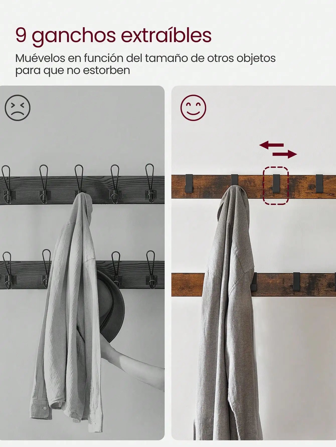 9 ganchos metálicos extraíbles: distribuidos en 2 filas, permiten organizar abrigos, bolsos o bufandas según su tamaño.